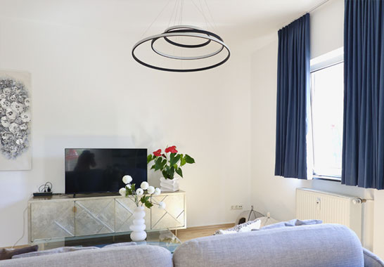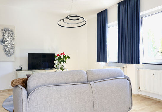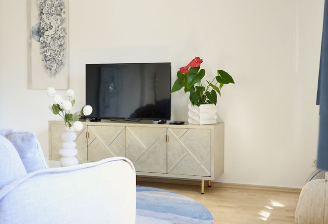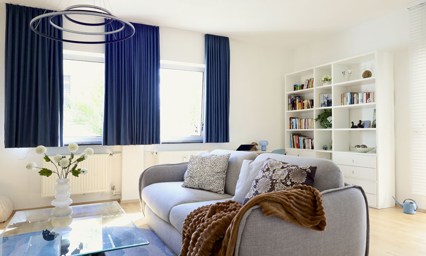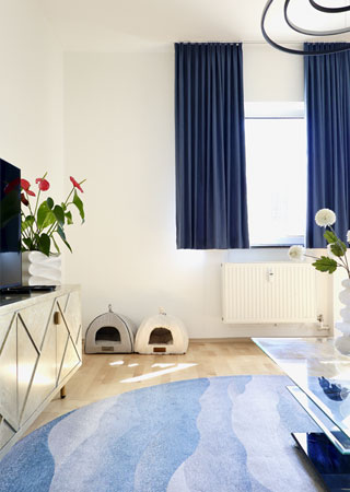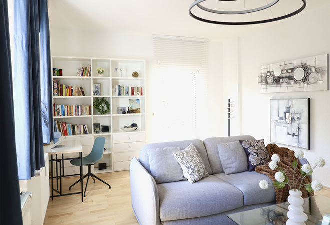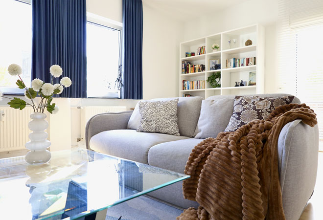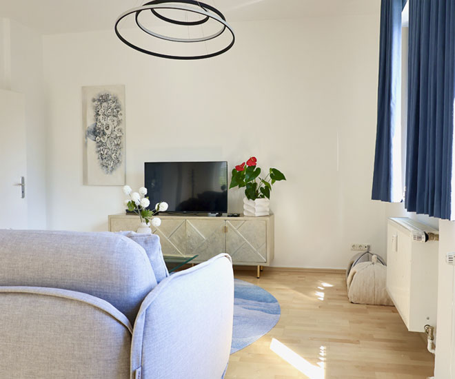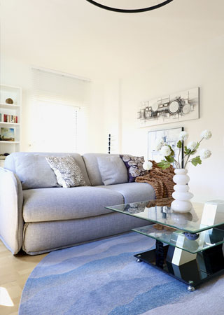Meine Kundin wünschte sich für ihr neues Zuhause, dass ihre Lieblingsfarben Blau-Silber-Weiß in den neuen Wohnbereich den Vorrang bekommen. Dennoch sollte das Gesamtergebnis nicht ‚kühl‘ wirken sondern einladend und gemütlich.